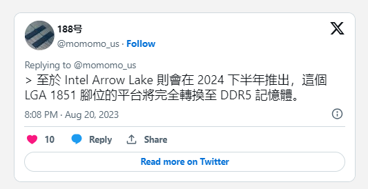 Cùng một tweet cũng cho thấy rằng không nên mong đợi dòng sản phẩm Arrow Lake-S của Intel cho đến nửa sau của năm 2024. Dường như khả năng cao là Raptor Lake Refresh sẽ tiếp tục là nền tảng máy tính để bàn chính của Intel trong tương lai có thể nhìn thấy.